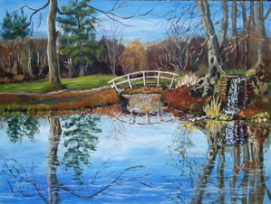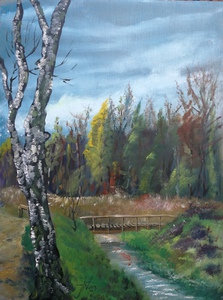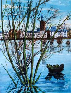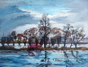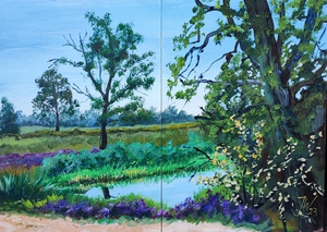 2023Prachtig vennetje, in de vroege lente ook al geschilderd, maar nu van de andere zijde. twee losse paneeltjes naast elkaar aan de ezel en de acrylverf plakt het vanzelf aan elkaar.